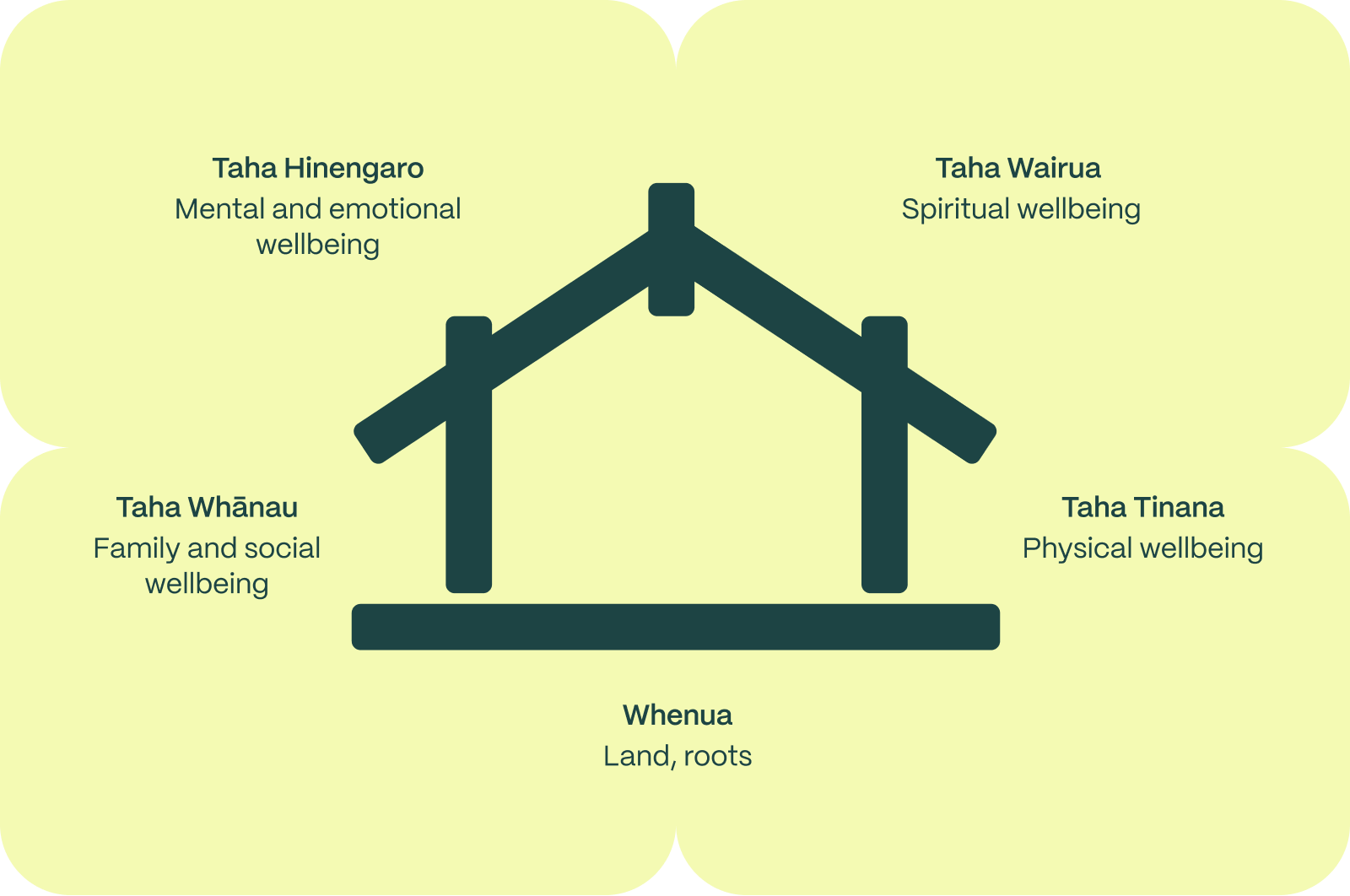 The Māori model Te Whare Tapa Whā describes wellbeing as a wharenui (meeting house), with each wall representing one of the four dimensions of holistic wellbeing.